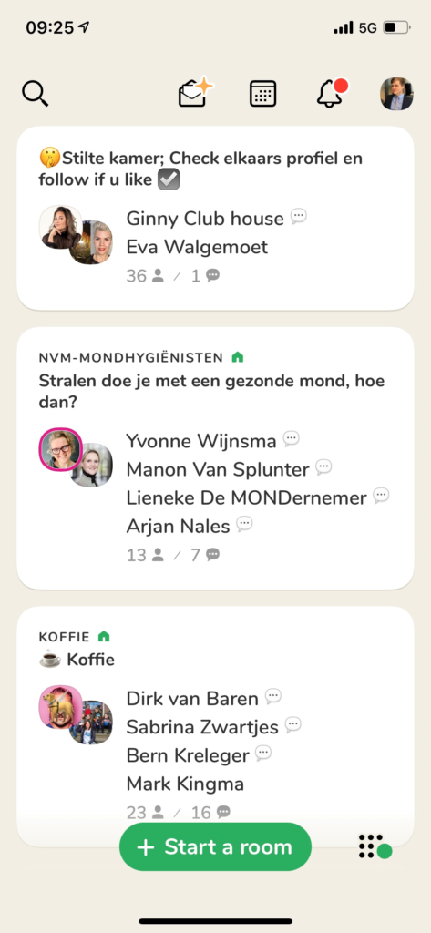 ‘Home’, hierin kun je aan verschillende kamers deelnemen. Er zijn verschillende kamers met diverse onderwerpen.