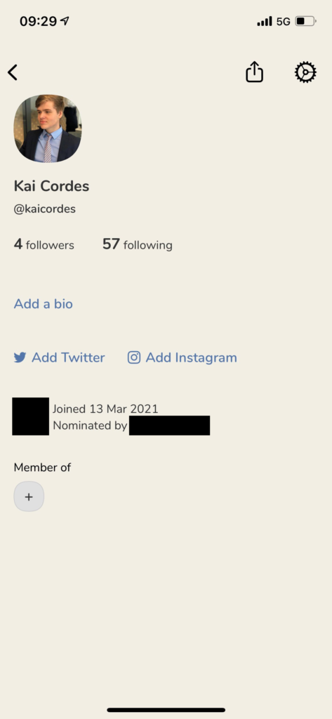 Hieronder vind je een voorbeeld van een profiel. Je kan een bio toevoegen, mensen volgen en gevolgd worden. Ook kun je op iemands account zien door wie hij of zij is uitgenodigd. Je kunt je account koppelen aan een ander social media platform als Instagram of Twitter. Ook kun je toegang krijgen tot een ‘club’ als je actief genoeg bent.