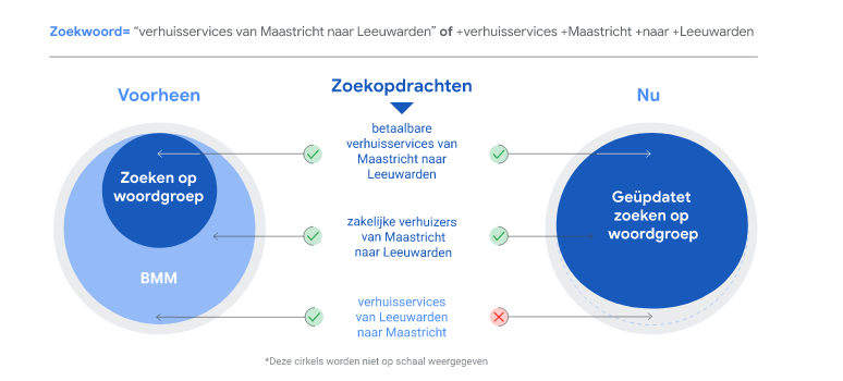 In het bovenstaande overzicht is duidelijk weergeven wat de Phrase matches voor de update waren en wat de matches na de update zullen zijn. Zoektermen met woorden in het midden verwerkt werden voorheen in de Broad Match Modifier vastgelegd. Na de update zullen deze zoektermen als Phrase match worden vastgelegd.