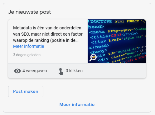 Extra bijkomstigheid is dat nieuwe blogartikelen of pagina’s op je website sneller geïndexeerd worden wanneer je deze ook op je Google Mijn Bedrijf vermelding deelt. Of dit echt waar is, zijn we nog niet achter. 😉