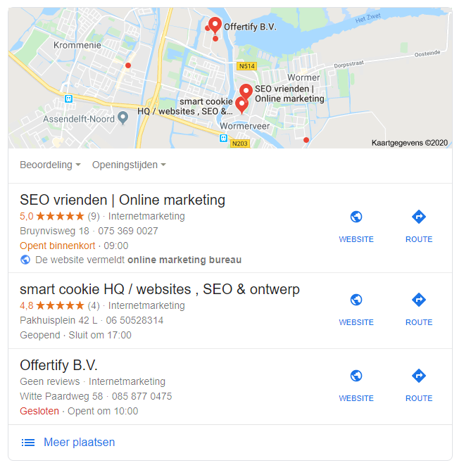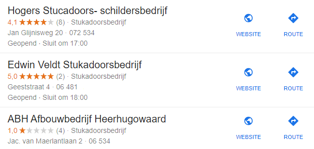 Kijk bijvoorbeeld naar bovenstaande vermeldingen. Welk bedrijf zou jij als eerst bellen? Waarschijnlijk degene met de meeste sterren en/of de beste beoordeling.