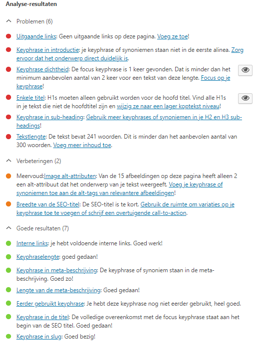 Met Yoast kun je de SEO en de leesbaarheid van de tekst optimaliseren. Je krijgt bijvoorbeeld inzichten in hoe lang de meta-beschrijving moet zijn, of je wel uitgaande links hebt toegevoegd en zelfs hoe lang de tekst moet zijn. Je kunt gegevens invullen zoals op welk zoekwoord je wil ranken of wat de SEO-titel is en Yoast verwerkt het in Google.