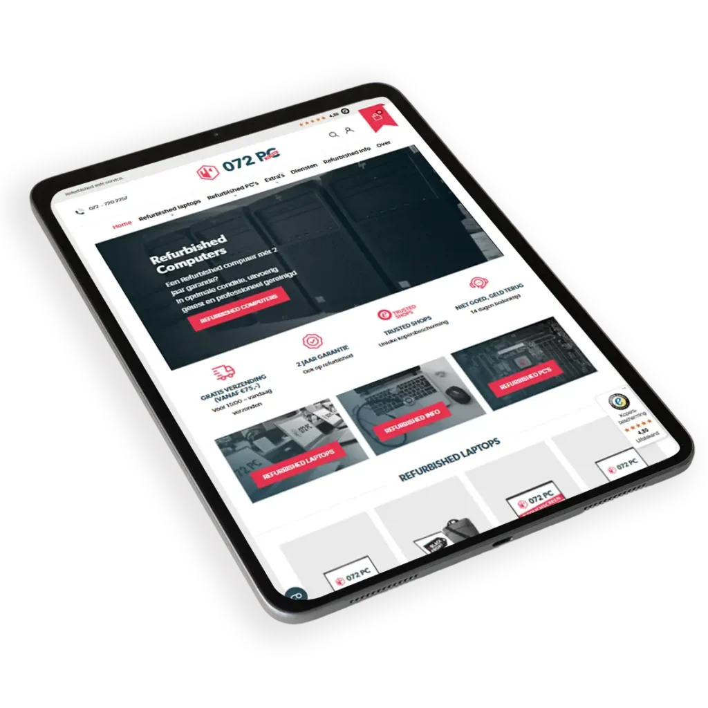 072-PC is specialist in refurbished computers en laptops, zowel online als in hun winkel in Alkmaar. Toen ze bij ons kwamen, liepen meerdere Google Ads campagnes niet zoals gewenst en waren ze minder zichtbaar op hun eigen merknaam. Wij hebben de problemen opgelost, nieuwe campagnes ingericht en de webshop geholpen om veel sterker te presteren. Inmiddels behalen ze een sterke ROAS, is hun organische zichtbaarheid flink gestegen en blijven we structureel werken aan verdere groei!