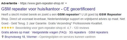De reviewsterren in Google zijn verkopersbeoordelingen en worden weergeven in Google Ads tekstadvertenties. Deze beoordelingen kunnen de effectiviteit van de advertentie verghogen, doordat mensen zien dat jouw bedrijf goed scoort op het gebied van service.