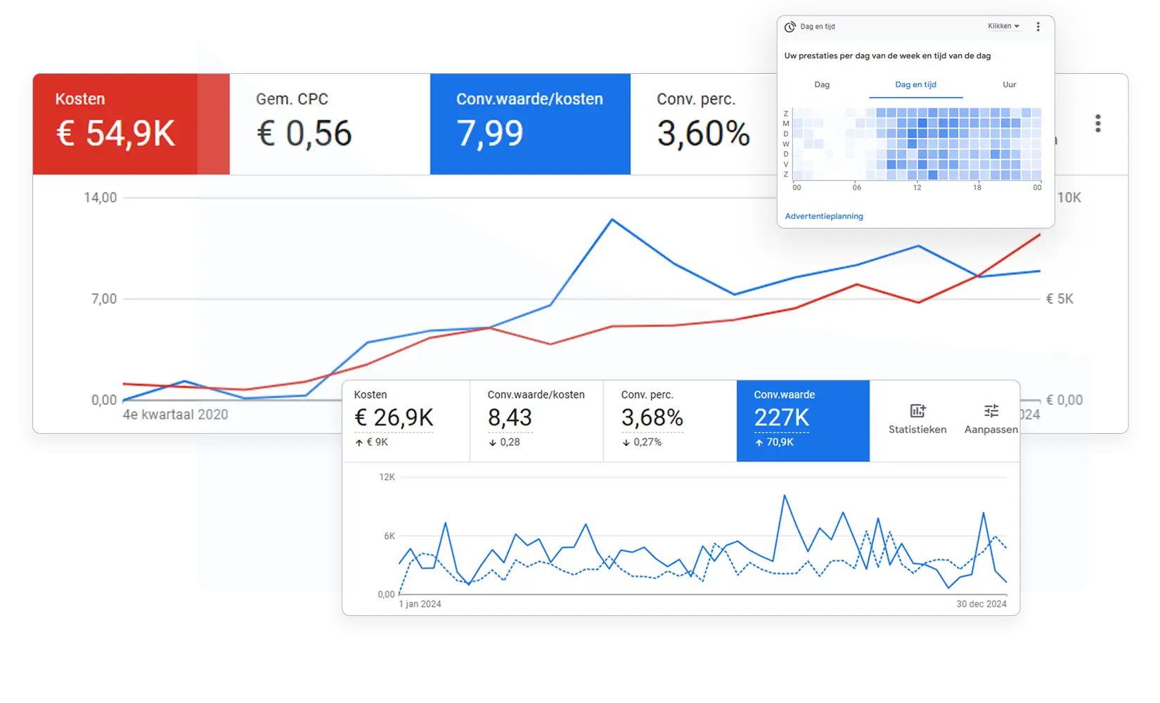 Of het nu gaat om leadgeneratie of e-commerce: we zorgen dat alles klopt én dat jij precies weet wat het oplevert. Verwacht geen standaard beheer, maar een proactieve aanpak die werkt.