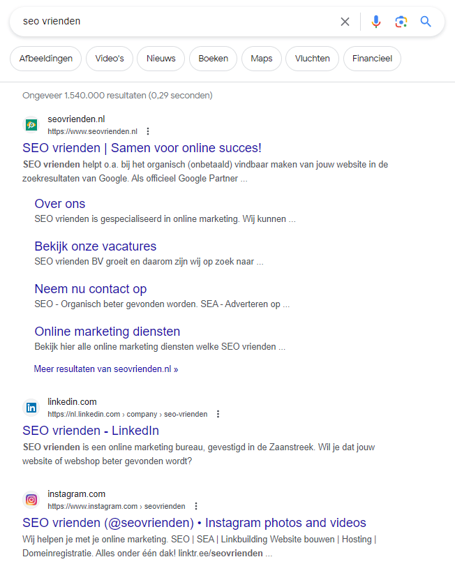 SERP is een afkorting en staat voor Search Engine Result Page. Dit is wat je ziet na het uitvoeren van een zoekopdracht. Dit zit er als volgt uit: